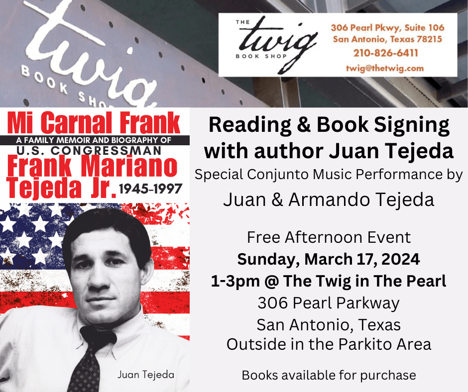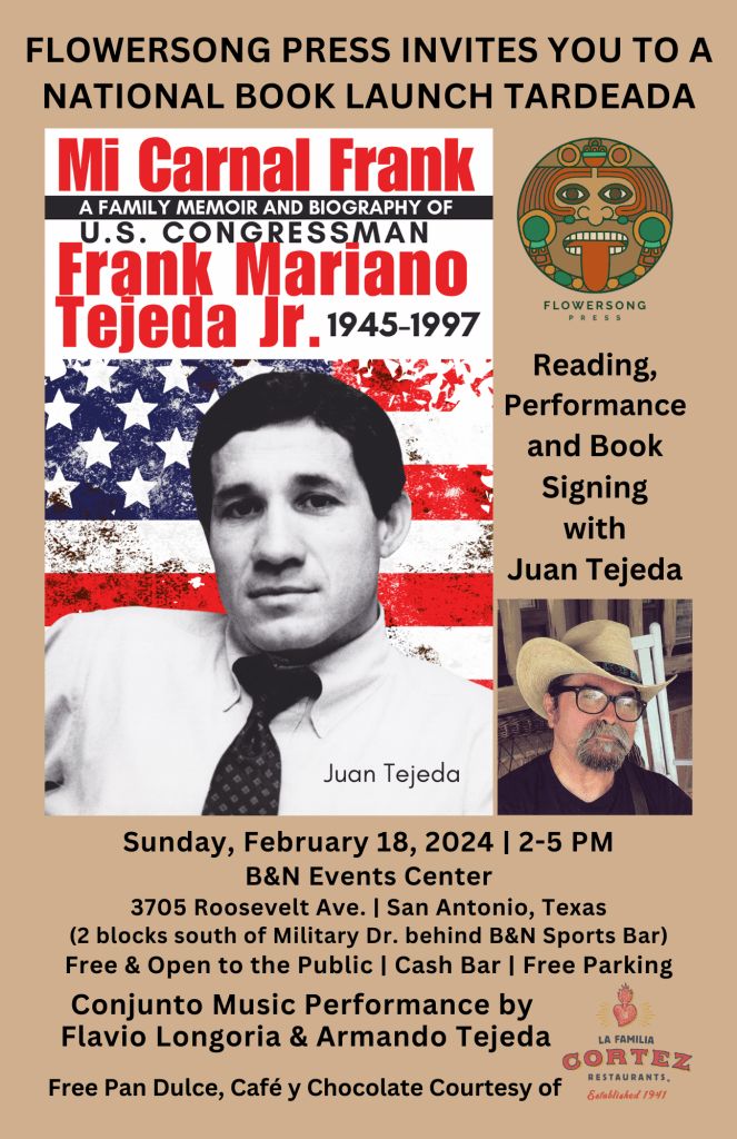 Check out the complete, almost two-hour, live-streamed book reading of Mi Carnal Frank by Juan Tejeda, Conjunto Music performance by Juan & Armando Tejeda, and discussion at the Latino Bookstore & Gift Shop in San Antonio, Texas, which was sponsored by the Mexican American Civil Rights Institute and the Guadalupe Cultural Arts Center on Feb 24, 2024: https://www.facebook.com/SomosMACRI/videos/832697258619010
